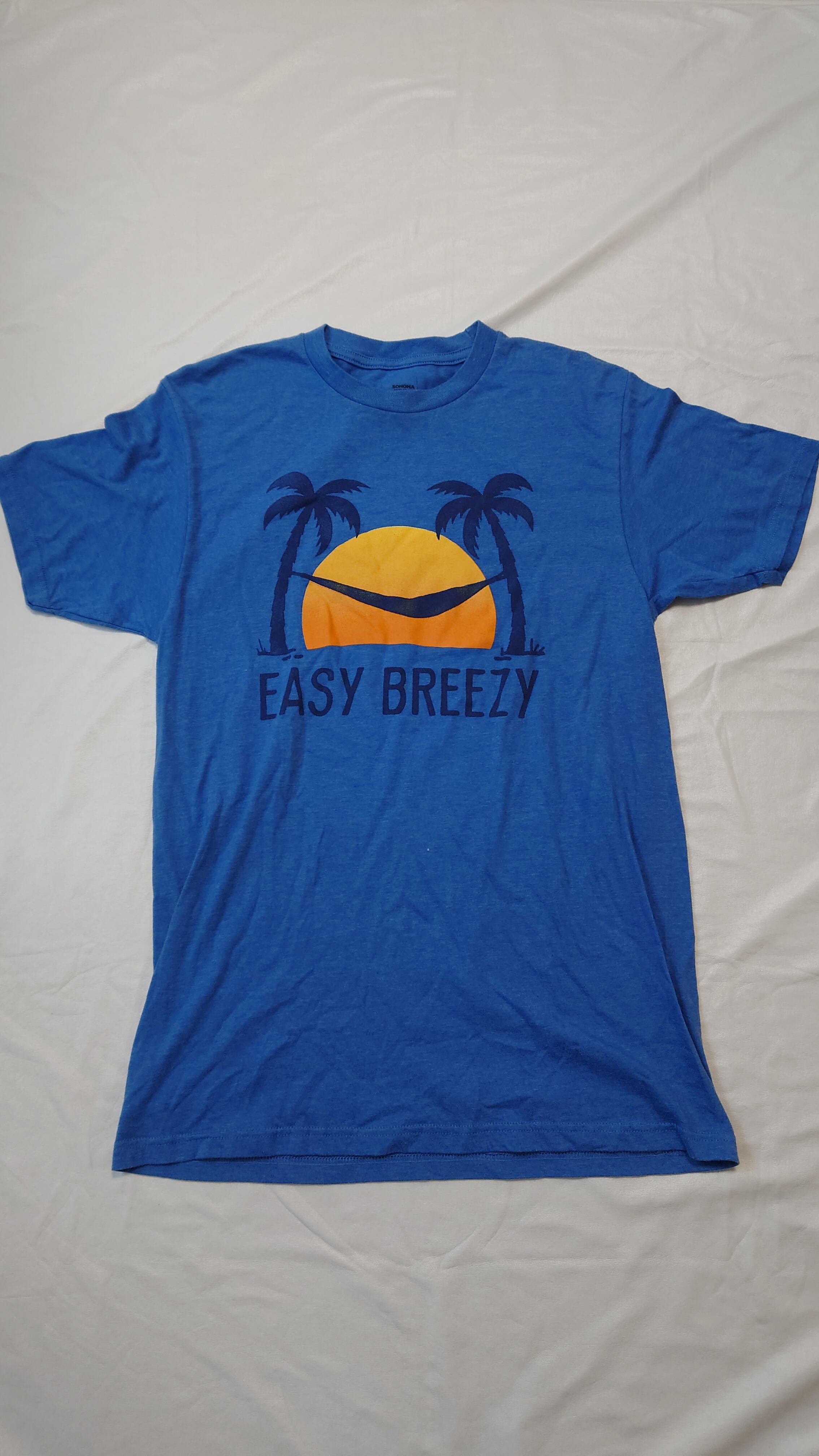 夕日に揺れるハンモックのシルエットが印象的な、爽やかブルーのEASY BREEZY Tシャツ。