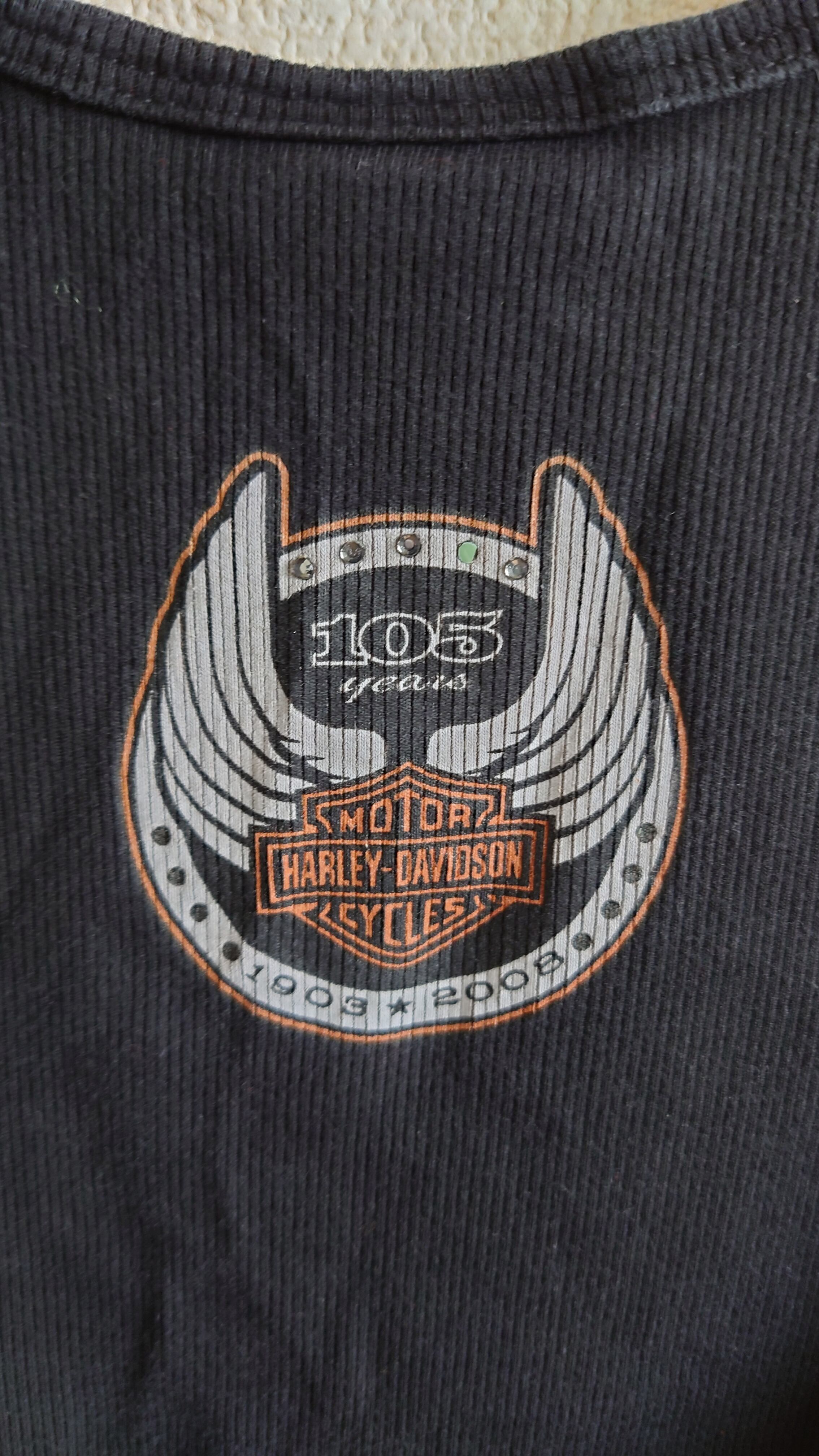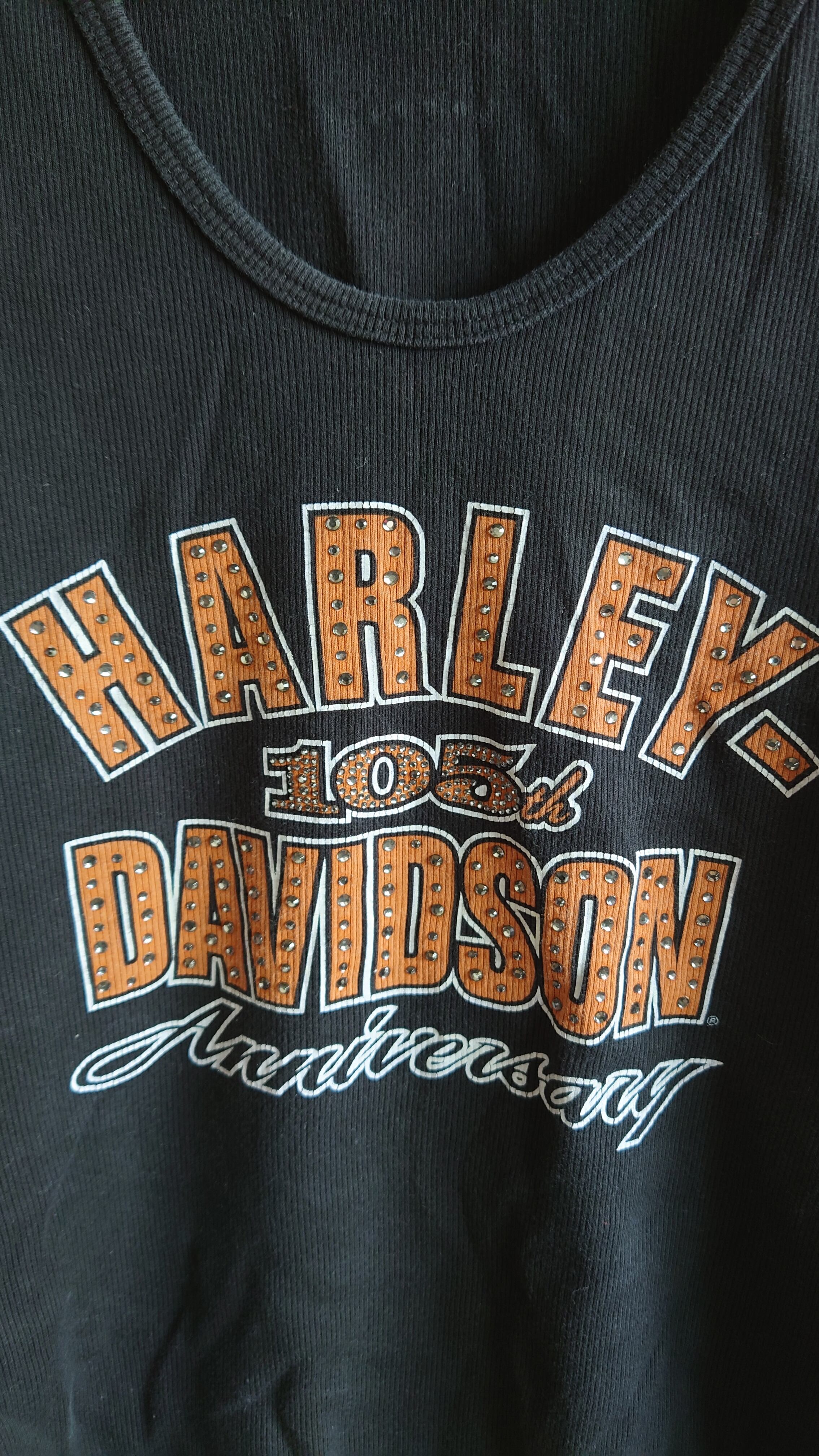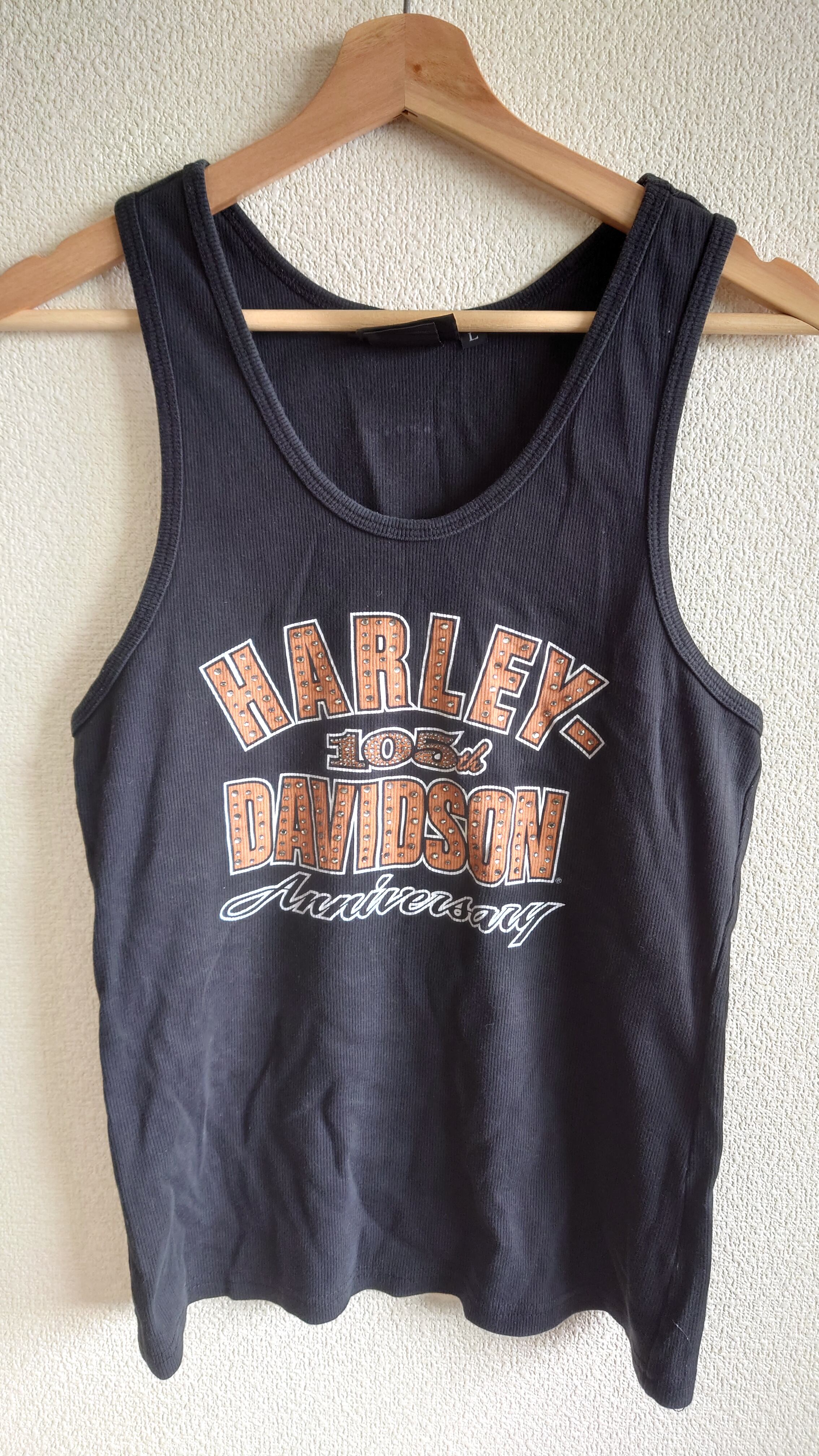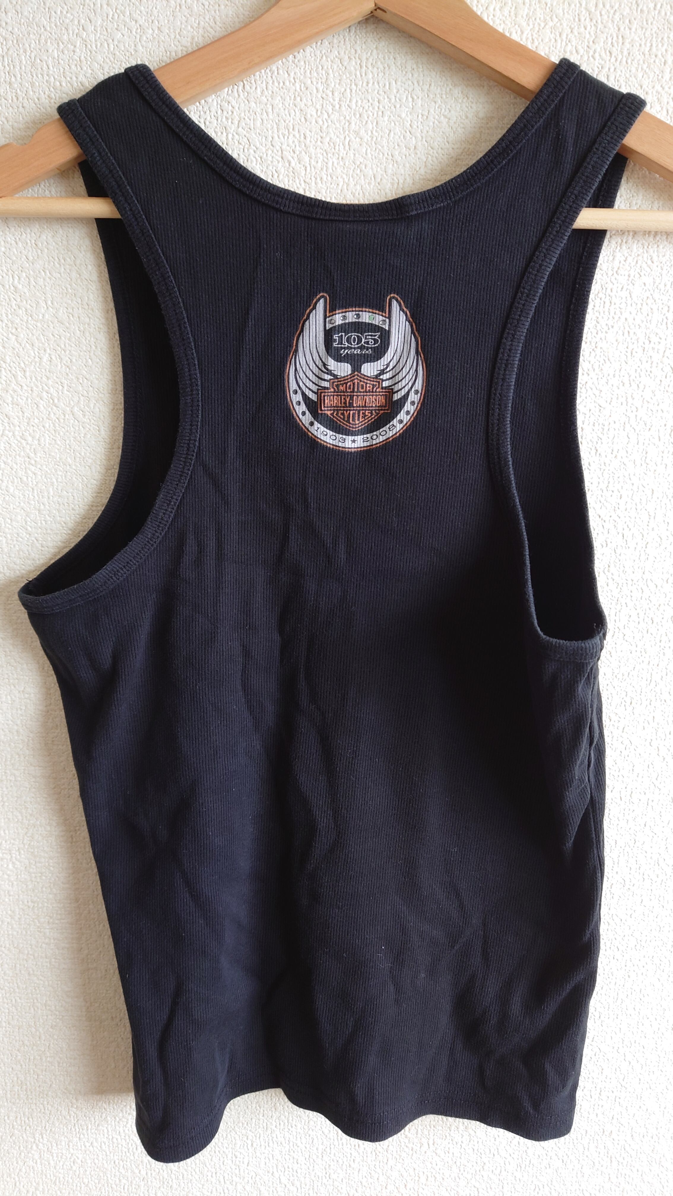 ■2008年の105周年を記念して作られた、HARLEY-DAVIDSONのリブタンクトップ。MADE IN USAにこだわった当時の希少な一着で、フロント・バックともにアニバーサリーロゴがしっかり主張。インナーでも一枚でもキマる、ストリート&バイカーの夏スタイルに必携の名作です。