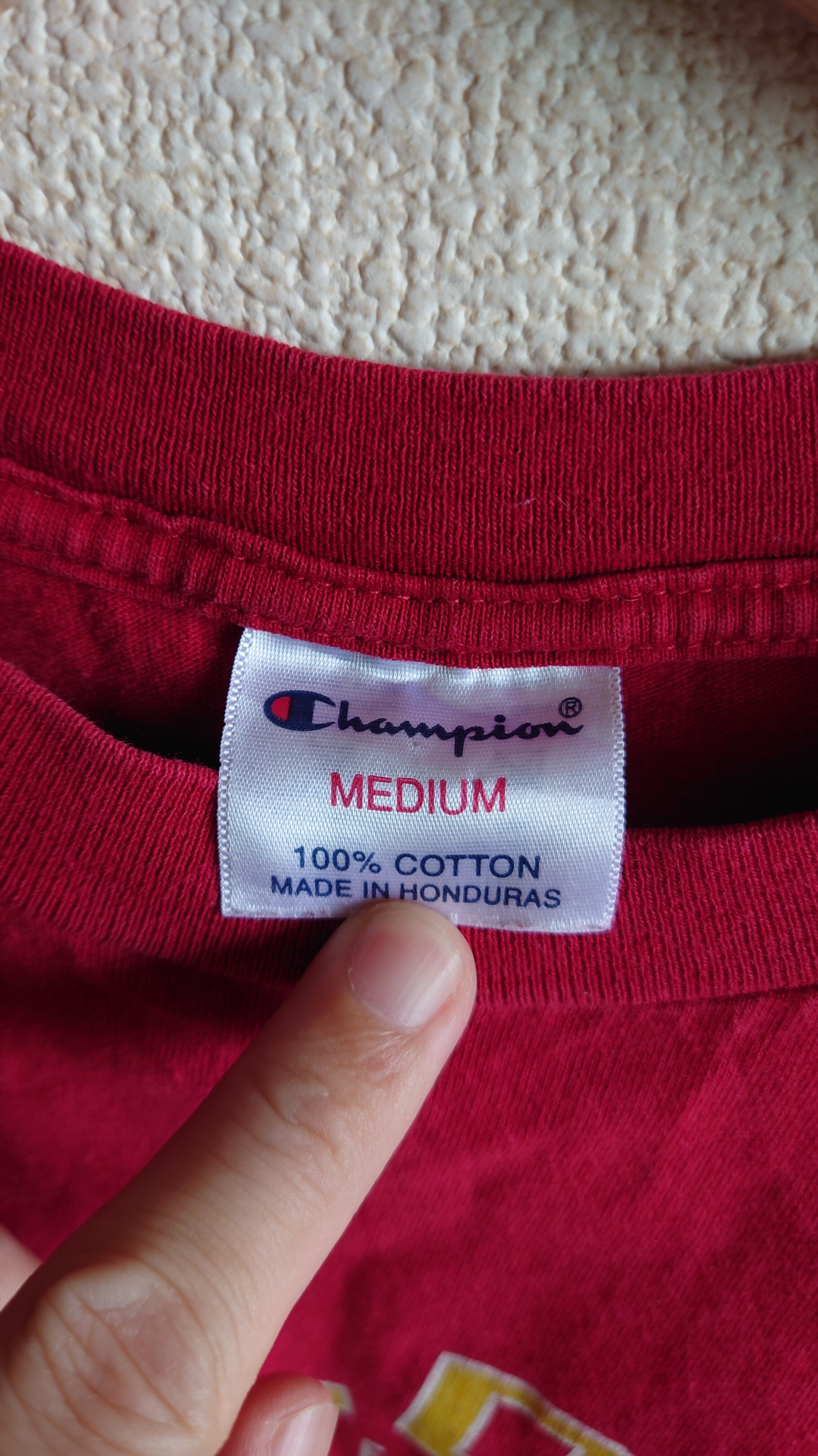 ■チャンピオンの定番無地T。目立ったプリントはなしだが、深みのあるレッドカラーが◎。差し色使いにぴったりで、オーバーサイズコーデとも好相性。